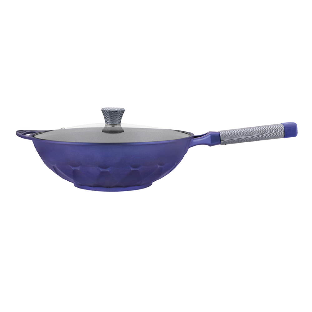 采用钻石切割的外观设计,更精致,内嵌进口蓝钻颗粒,5倍硬度10倍耐磨,航天PEEK纤维层,等离子沙化物理不粘,100%可再生铝基材,健康少油烟,无盖重量约1.43kg,超轻锅身,轻松烹饪。